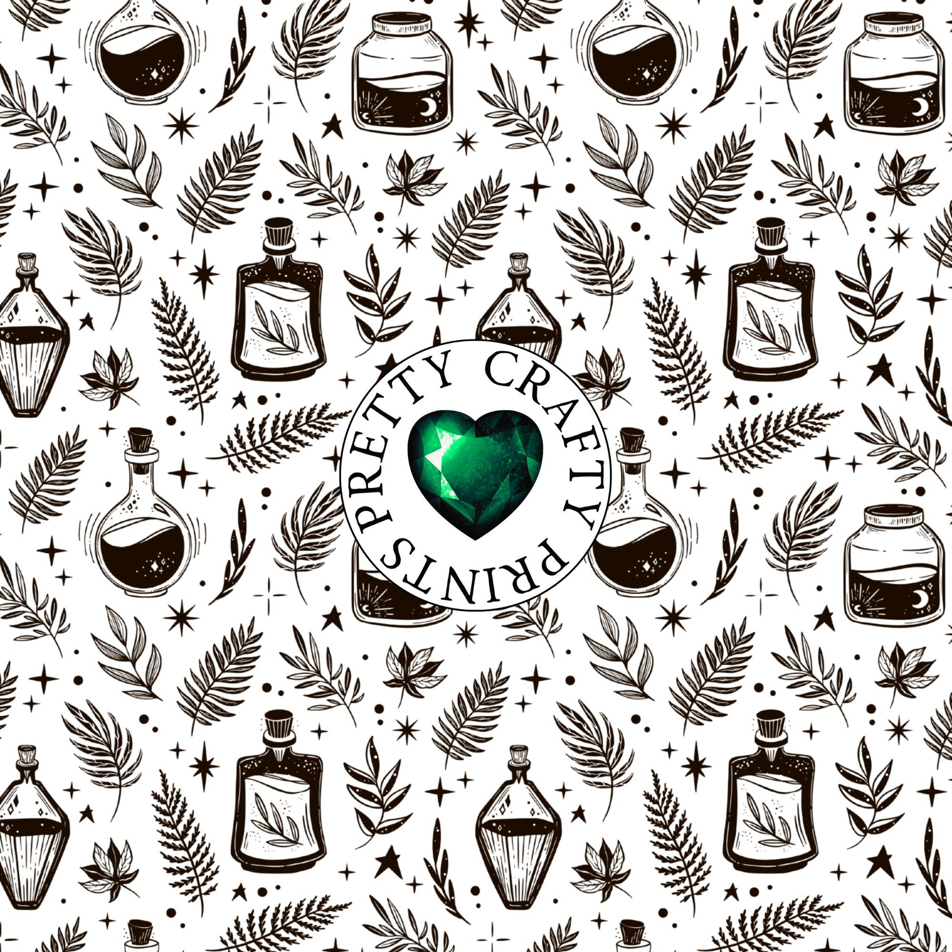 This enchanting Botanical Apothecary Vinyl Print blends nature and magic in a seamless black-and-white design. Featuring potion bottles, herbal jars, ferns, leaves, stars, and moons, this pattern evokes dark cottagecore, hedge witchery, and lunar herbalism all in one.